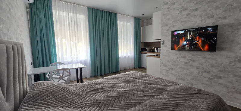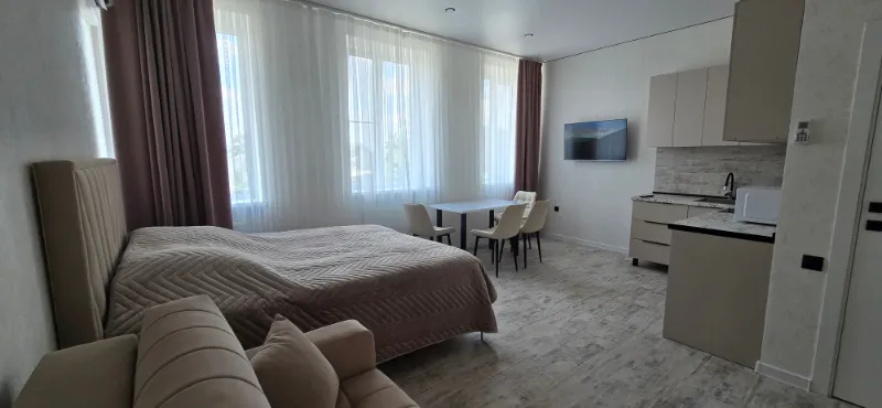 Интерьер выполнен в современном, спокойном стиле: мягкие оттенки, продуманная планировка и удобная мебель создают атмосферу расслабления. В номере предусмотрены зоны для отдыха, хранения вещей и комфортного сна — всё, чтобы пребывание было по-домашнему приятным.
