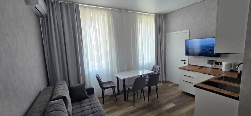 Интерьер выполнен в современном спокойном стиле: мягкие тона, продуманная мебель и уютная планировка создают атмосферу домашнего тепла. Простор позволяет комфортно отдыхать, работать или проводить время вместе, не ощущая стесненности.